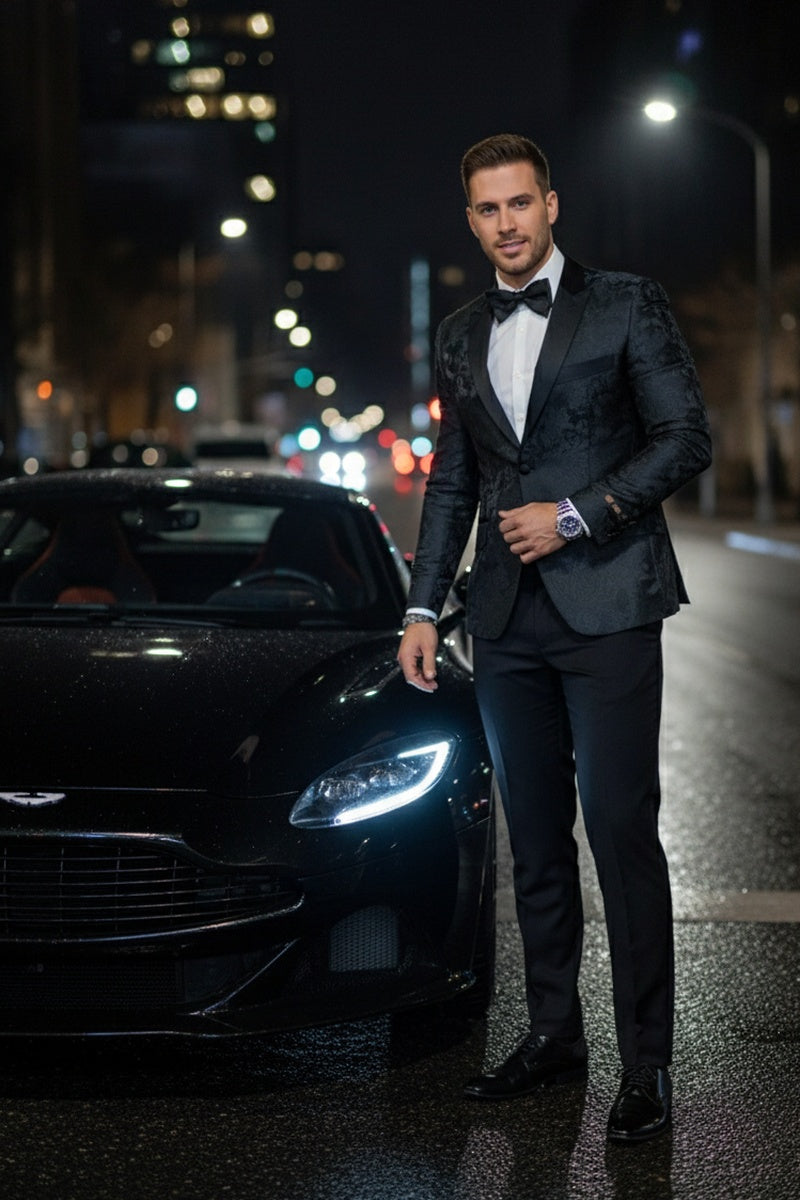 "Amsterdam" Black Tuxedo Jacket, designed by Xander Xiao, is crafted using a beautiful woven fabric in an intricate modern floral pattern.