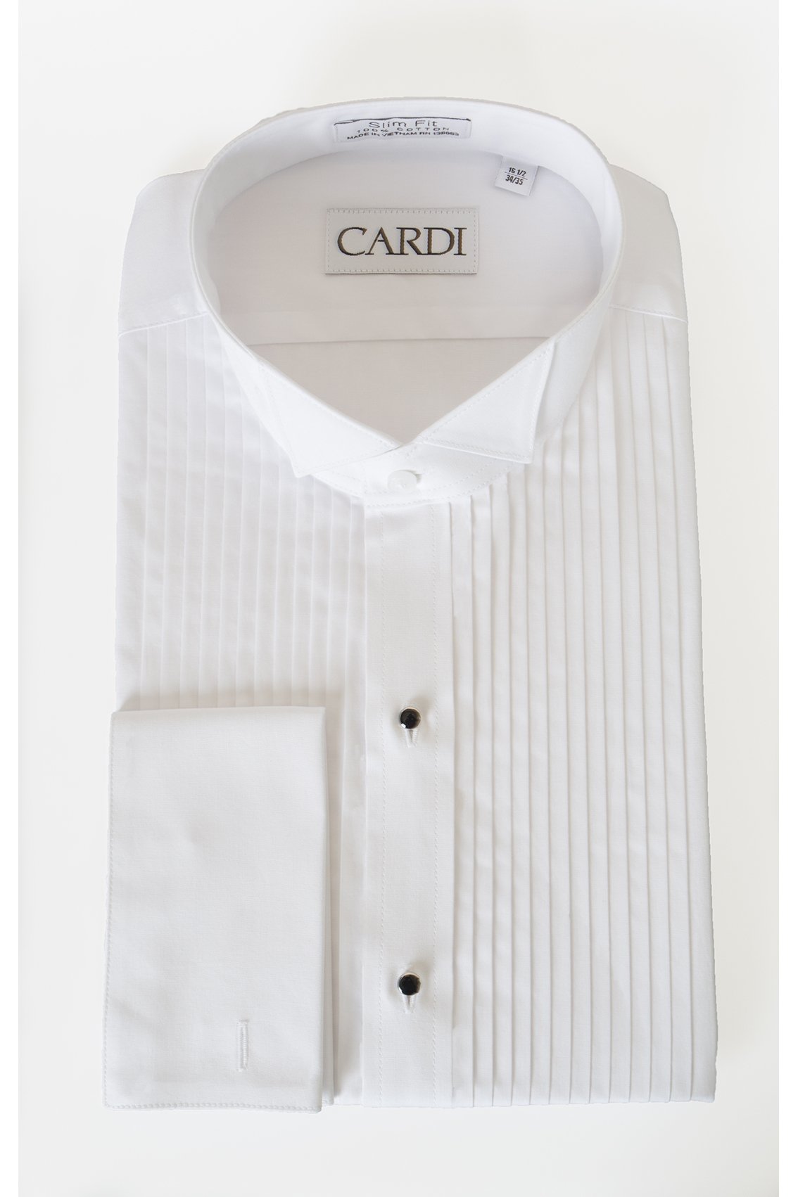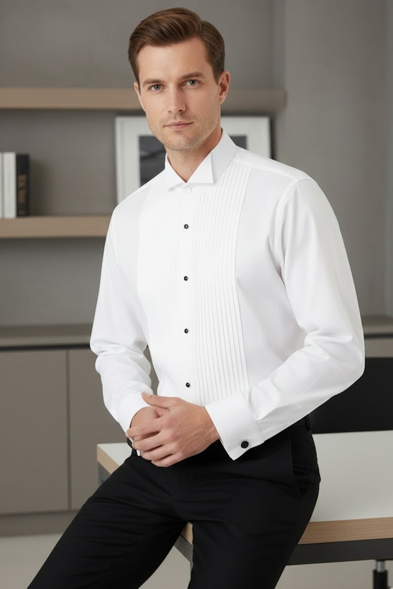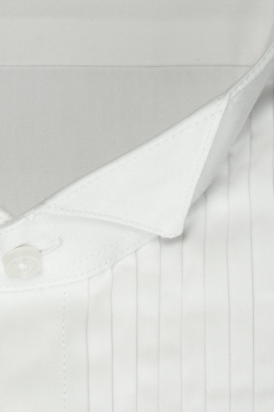 For the gentleman who appreciates tradition and the purity of a tuxedo look, we direct your attention to the "David" White Wingtip Tuxedo Shirt. The traditional wingtip collar is ready to serve as an effective backdrop for your bow tie. The formal vertical pleats, spaced 1/4 inches apart, flow down the entire length of the shirt (TIP #157: full length pleats are always better than bib length pleats).
