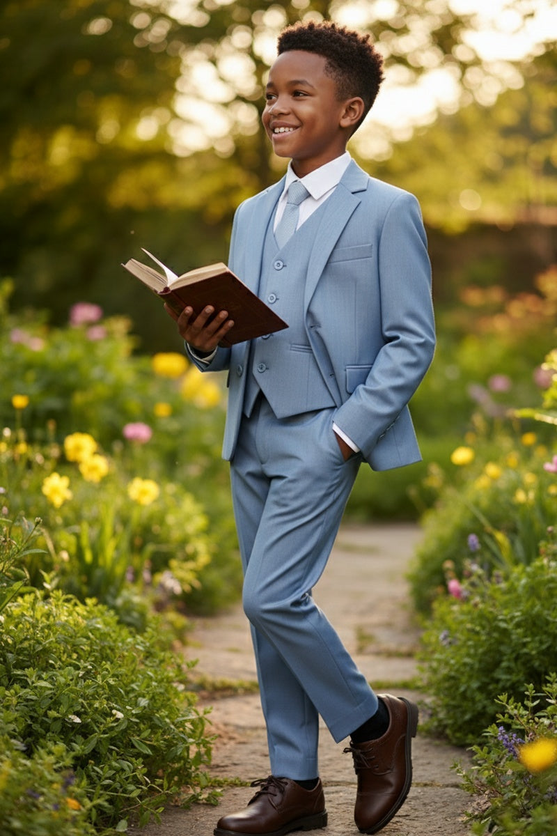 The "Liam" 5-Piece Suit Set, designed by BLACKTIE, is part of our Stretch Collection (our most luxurious collection). Premium jacket, pants, and vest fabric consists of four-way stretch so your little one can still run & play in comfort. Stretch interior lining, a stretch shirt, expandable pants, and adjustable vest & necktie were designed to provide the most comfort possible. The overall craftsmanship of the Stretch Collection is equal to what you find in premium adult version suits. When only the best will do for your precious son or daughter, the Stretch Collection is the way to go!