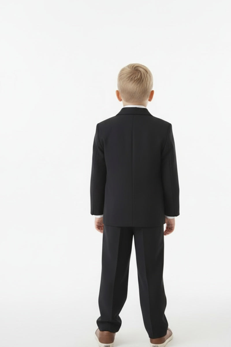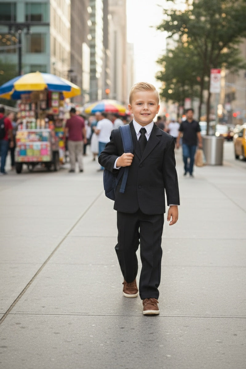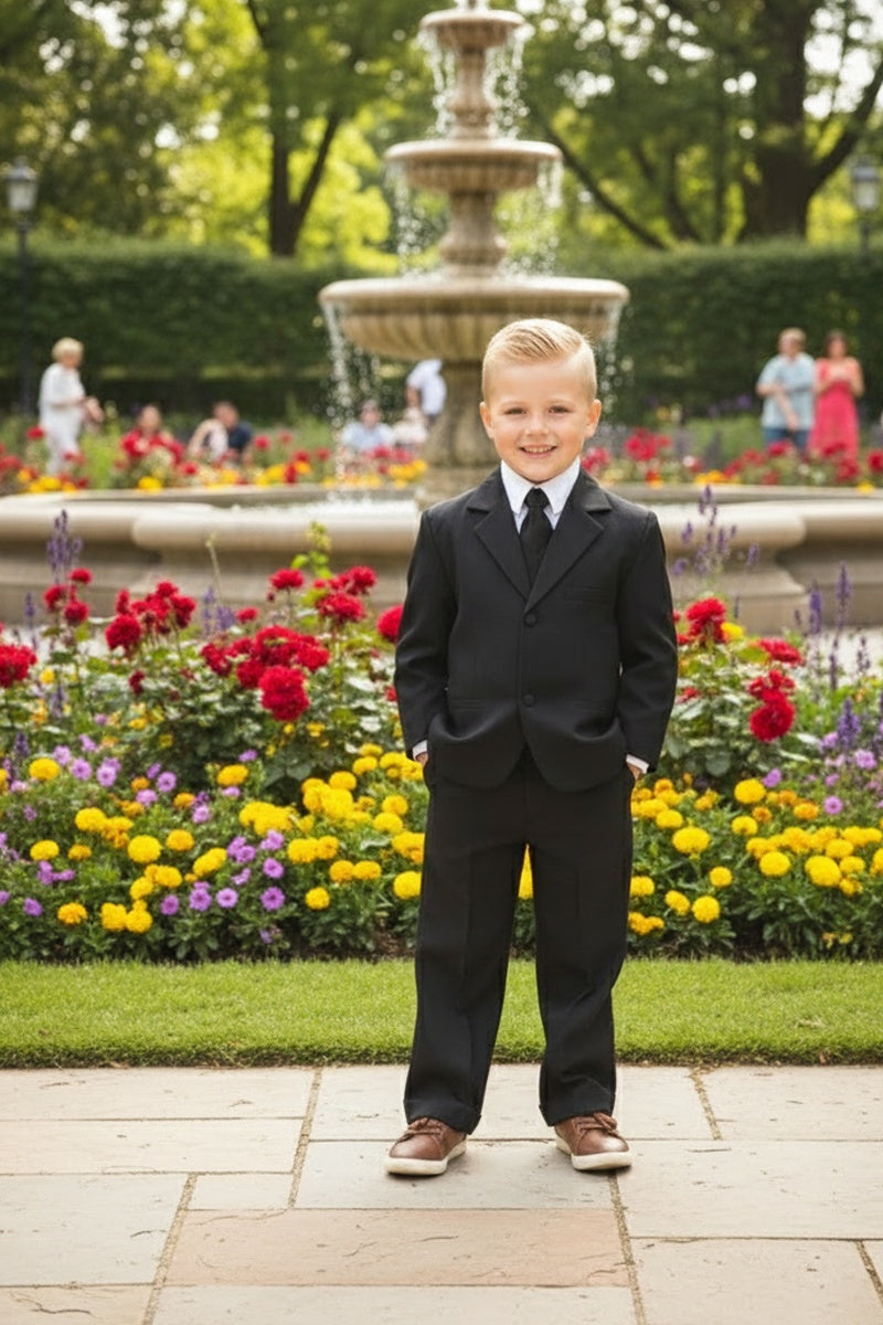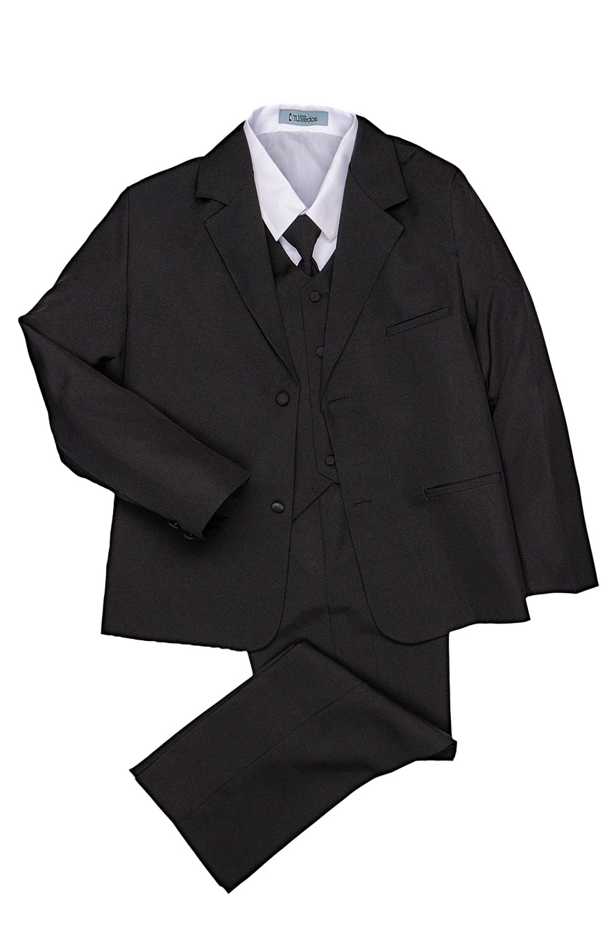 The "Mason" 5-Piece Suit Set, designed by Little Tuxedos, is part of our Essentials Collection. At an attrdraft price point, the Essentials Collection is one of our best sellers! Available in both classic fit and husky fit, the Essentials will accommodate kids of different shapes & sizes. Kids also love to show off the interior blue abstract premium lining! An expandable waist feature, adjustable vest, and adjustable necktie provide additional comfort for your little one.