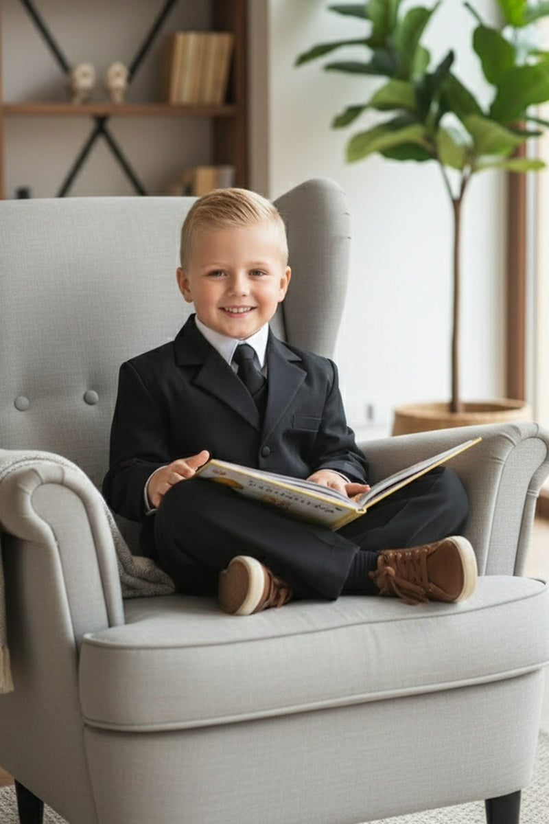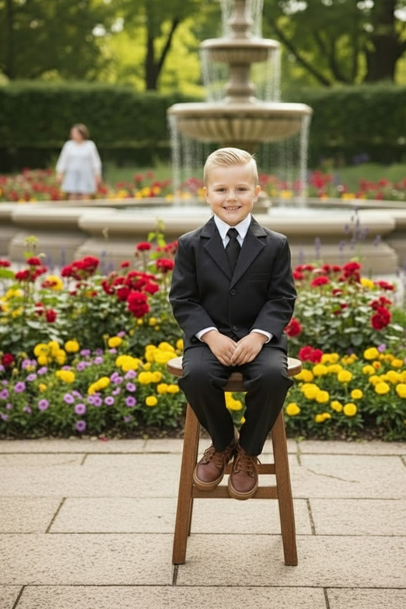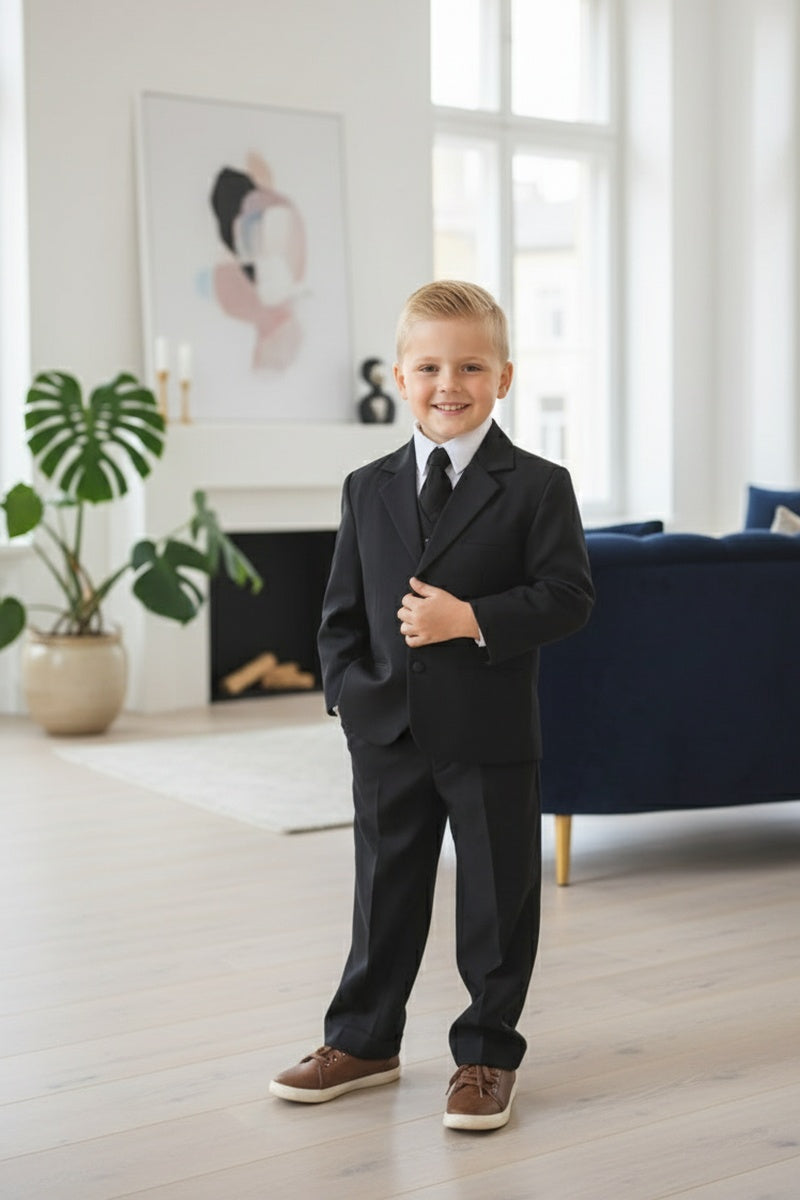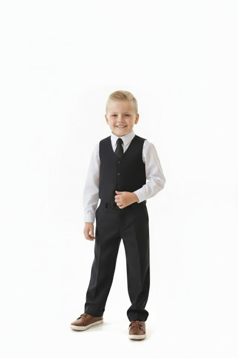The "Mason" 5-Piece Suit Set, designed by Little Tuxedos, is part of our Essentials Collection. At an attrdraft price point, the Essentials Collection is one of our best sellers! Available in both classic fit and husky fit, the Essentials will accommodate kids of different shapes & sizes. Kids also love to show off the interior blue abstract premium lining! An expandable waist feature, adjustable vest, and adjustable necktie provide additional comfort for your little one.