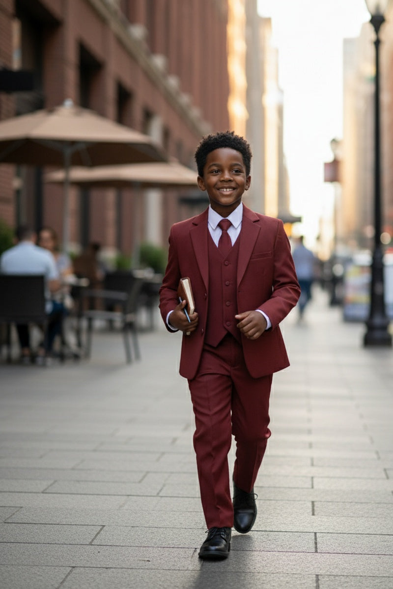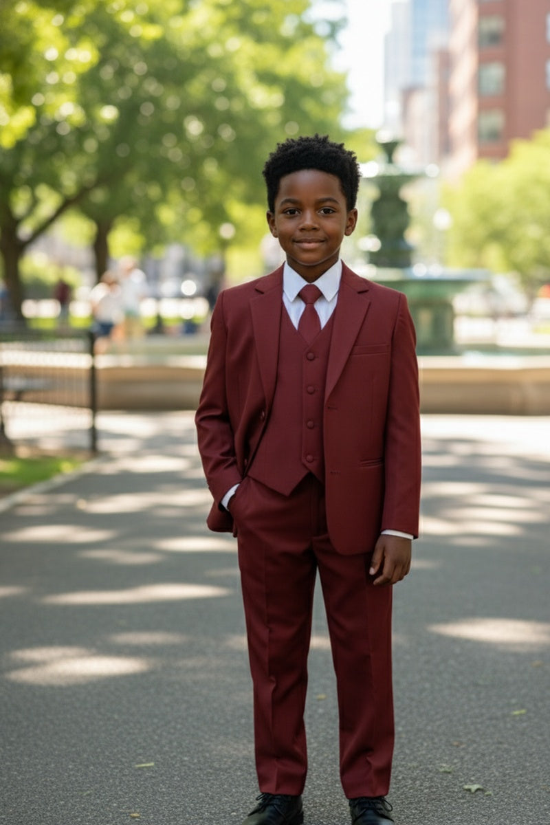 The "Mason" 5-Piece Suit Set, designed by Little Tuxedos, is part of our Essentials Collection. At an attrdraft price point, the Essentials Collection is one of our best sellers! Available in both classic fit and husky fit, the Essentials will accommodate kids of different shapes & sizes. Kids also love to show off the interior blue abstract premium lining! An expandable waist feature, adjustable vest, and adjustable necktie provide additional comfort for your little one.