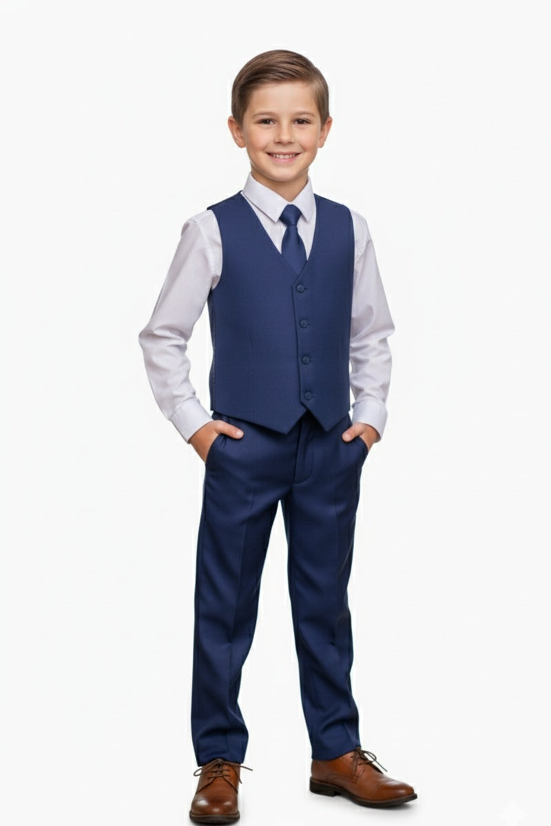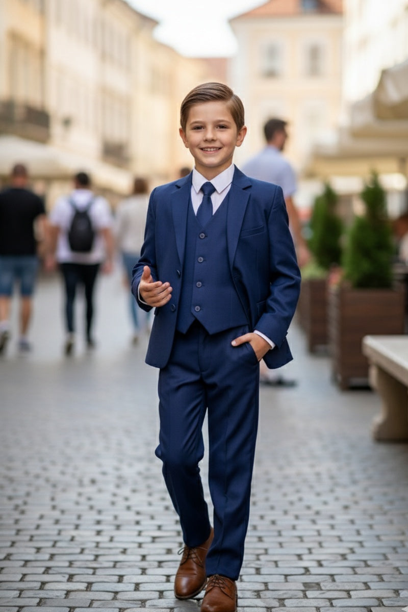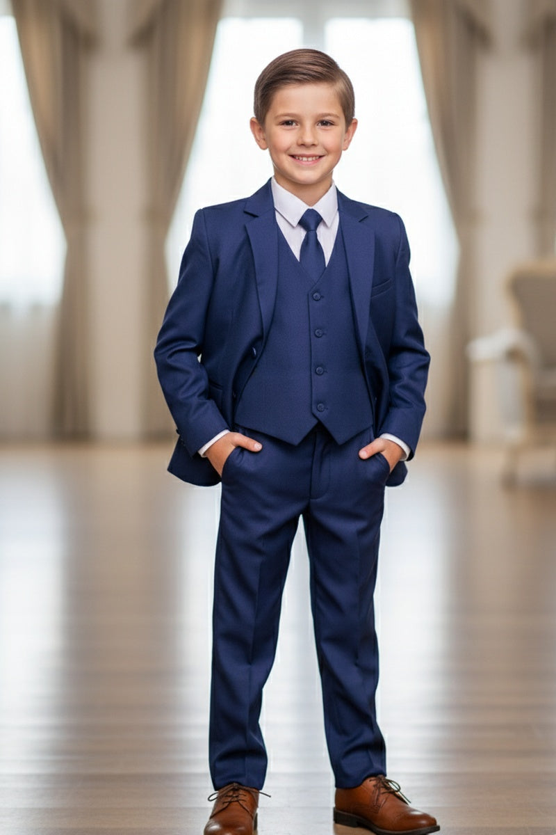 The "Mason" 5-Piece Suit Set, designed by Little Tuxedos, is part of our Essentials Collection. At an attrdraft price point, the Essentials Collection is one of our best sellers! Available in both classic fit and husky fit, the Essentials will accommodate kids of different shapes & sizes. Kids also love to show off the interior blue abstract premium lining! An expandable waist feature, adjustable vest, and adjustable necktie provide additional comfort for your little one.