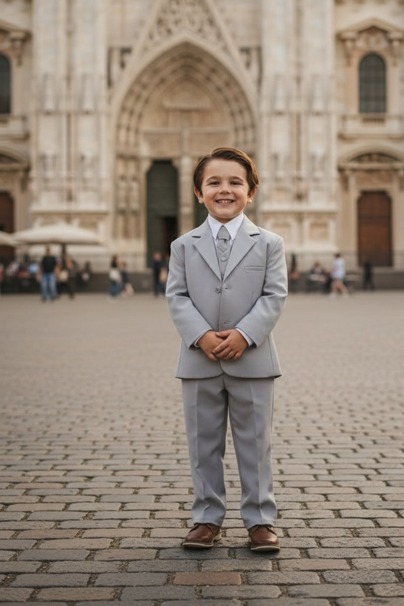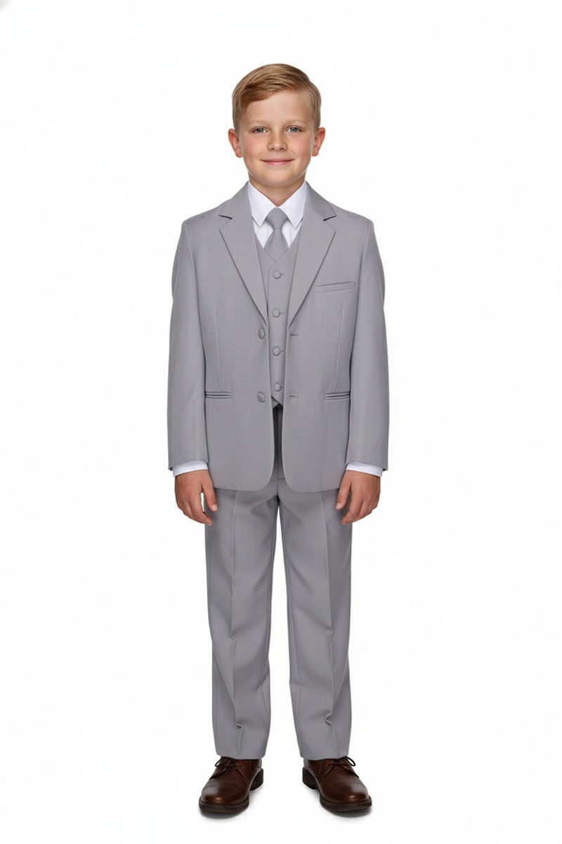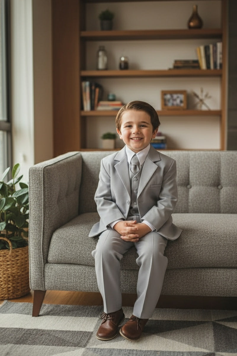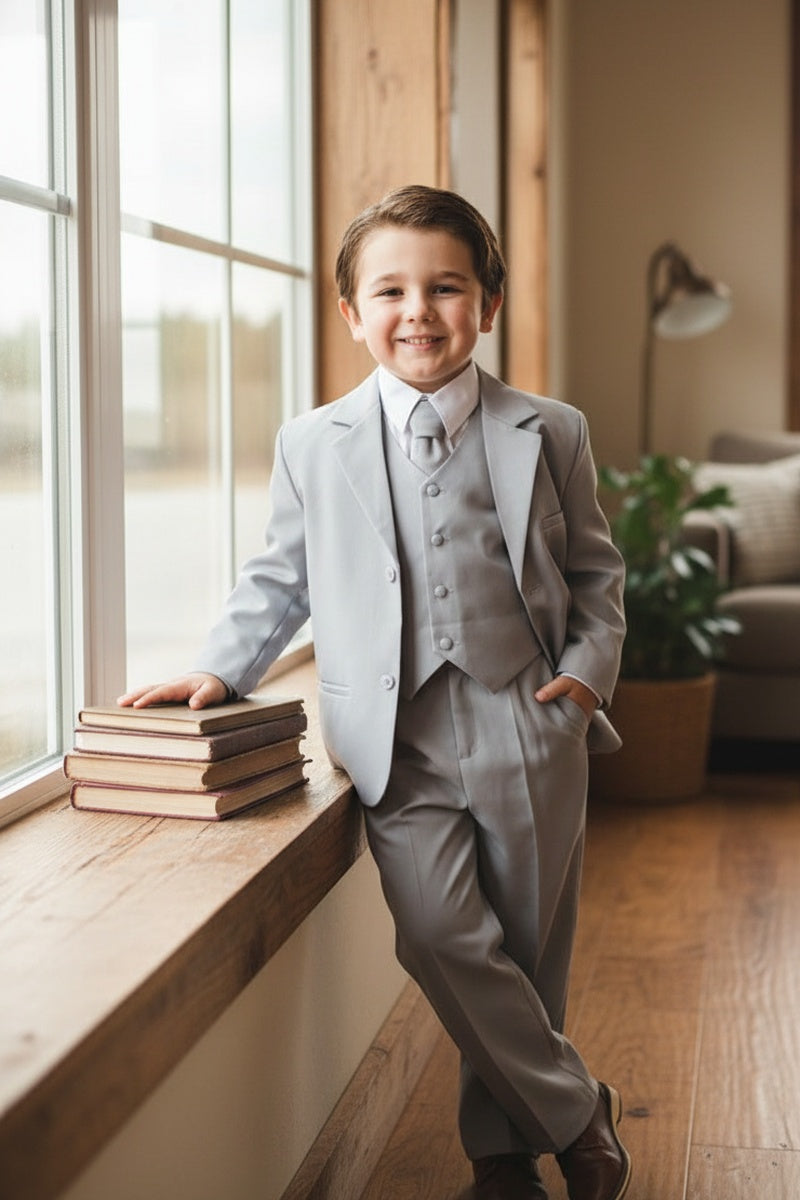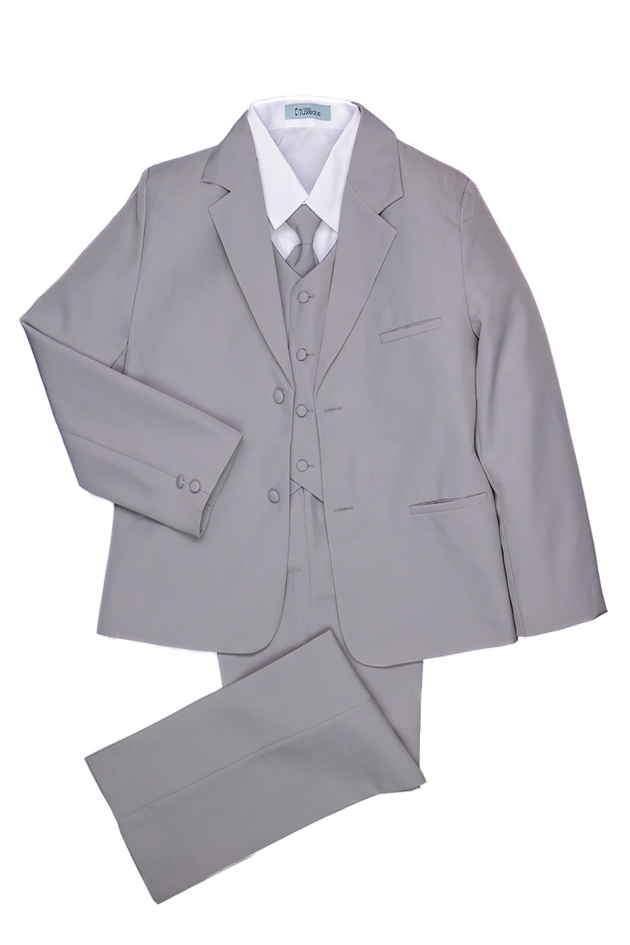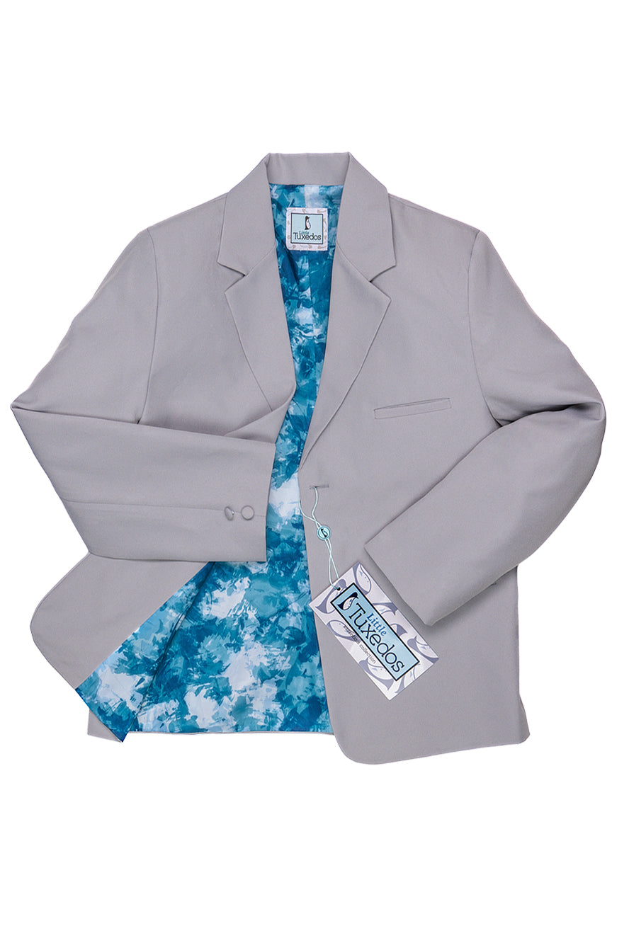 The "Mason" 5-Piece Suit Set, designed by Little Tuxedos, is part of our Essentials Collection. At an attrdraft price point, the Essentials Collection is one of our best sellers! Available in both classic fit and husky fit, the Essentials will accommodate kids of different shapes & sizes. Kids also love to show off the interior blue abstract premium lining! An expandable waist feature, adjustable vest, and adjustable necktie provide additional comfort for your little one.