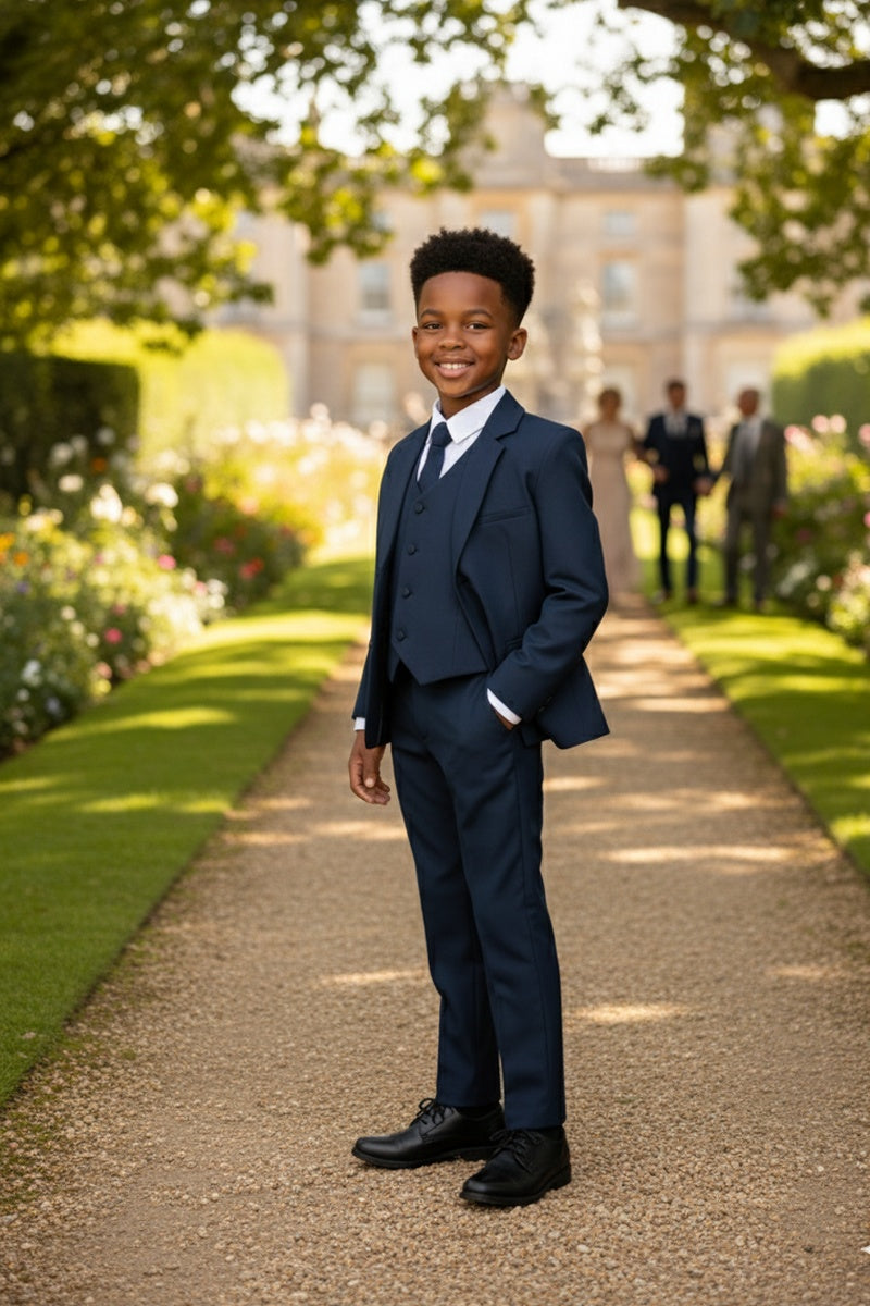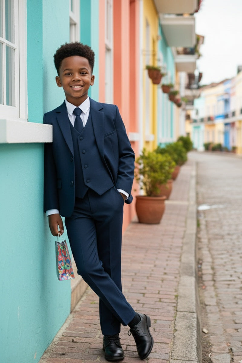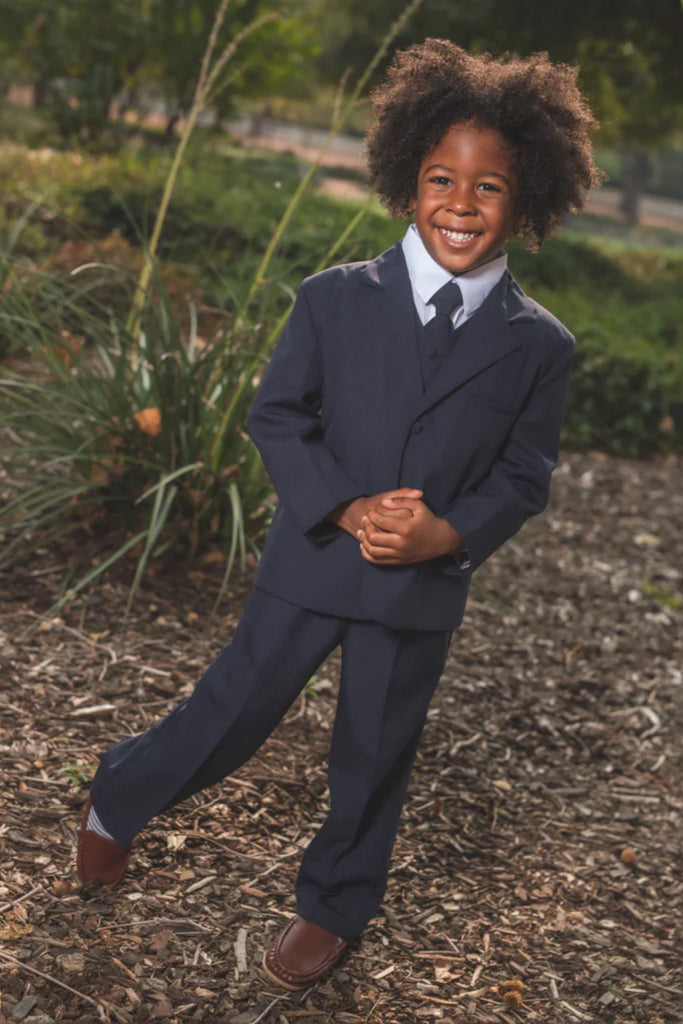The "Mason" 5-Piece Suit Set, designed by Little Tuxedos, is part of our Essentials Collection. At an attrdraft price point, the Essentials Collection is one of our best sellers! Available in both classic fit and husky fit, the Essentials will accommodate kids of different shapes & sizes. Kids also love to show off the interior blue abstract premium lining! An expandable waist feature, adjustable vest, and adjustable necktie provide additional comfort for your little one.