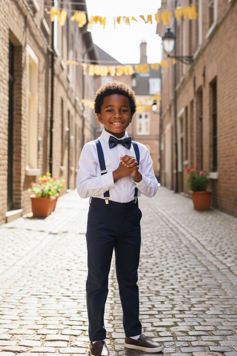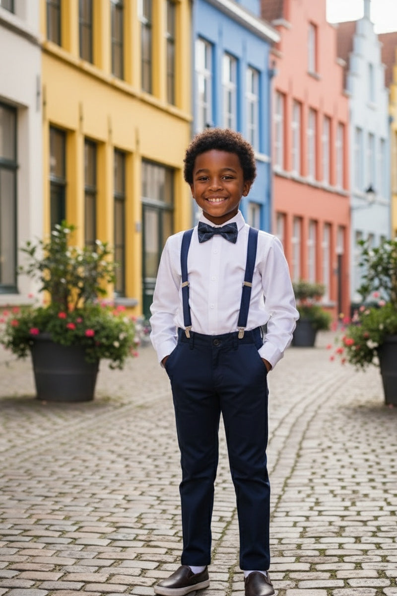 This 4-piece set includes the pants, shirt, suspenders and bow tie.
